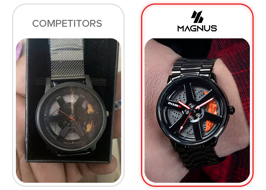 Jämfört med andra klockor med liknande design har Magnus-märkta klockor äkta anpassad 3D-modellering under safirglaset, till skillnad från pappersbaksida klockor som finns någon annanstans. www.magnus.watch eller www.magnus-luxury.com, magnus-brand.nl, magnus-brand.com är de enda ställen där du kan köpa officiella klockor från Magnus Brand. Var medveten om att förfalskade eller förfalskade klockor kan köpas online. Magnus Brand ansvarar inte för eventuella köp som görs på någon annan webbplats.